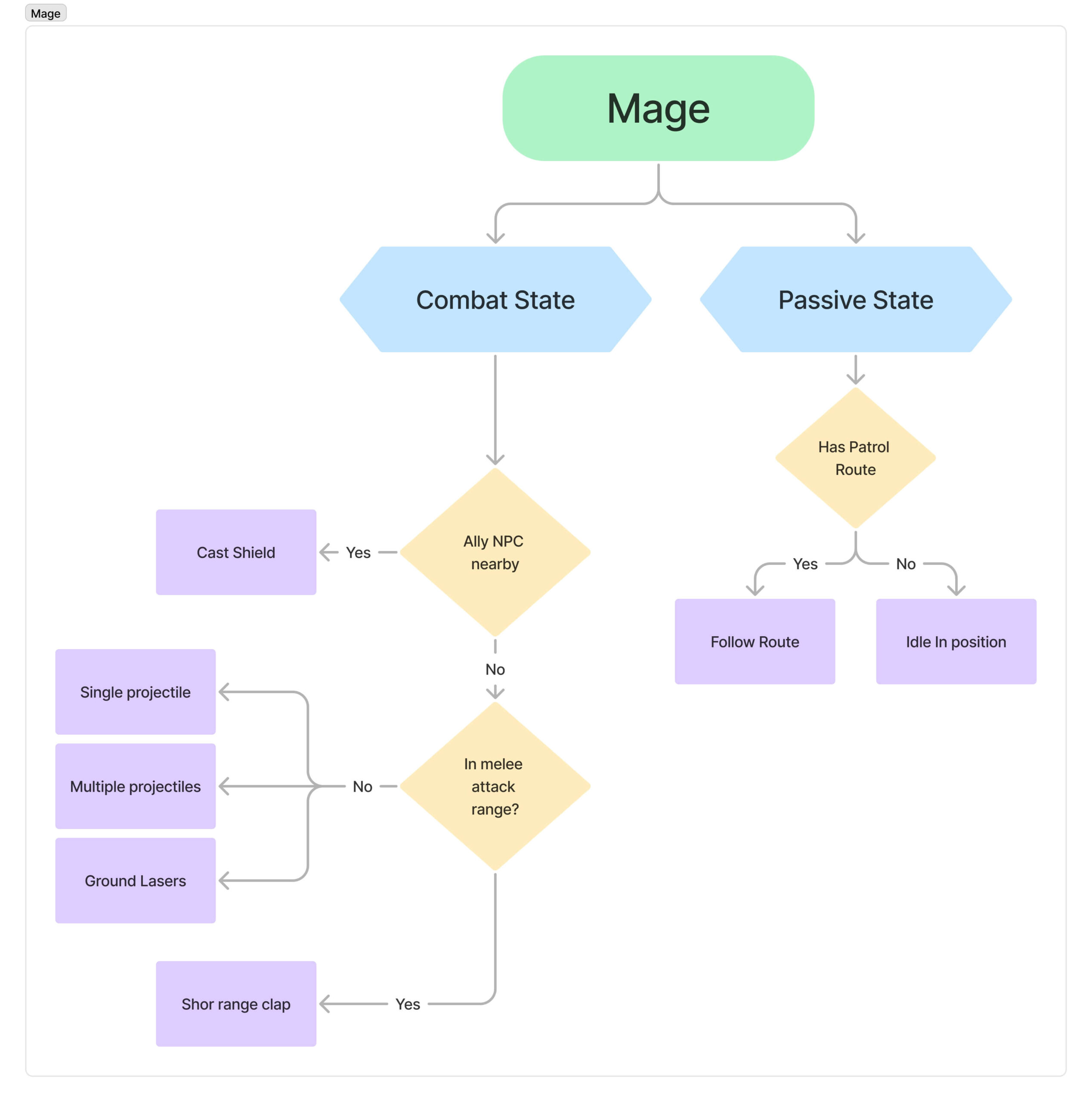 The third enemy we developed was the Mage, a powerful long-range combatant. As expected, its main advantage was the ability to attack from a distance using a variety of spells. The Mage was highly mobile, constantly attacking before relocating to a new position. This design choice forced players to adapt their strategy, making encounters more dynamic when a Mage was present.
