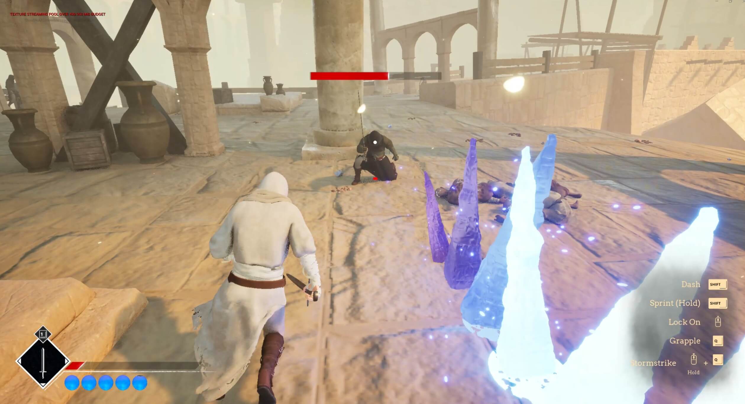 Visually, the Skirmisher was designed to be a mirror to the player to immediately tell the player that this was an enemy that shared similar abilities and methods of combat. Because of this, the Skirmisher could attack with a sword, dash, and use magic-based abilities like the player.